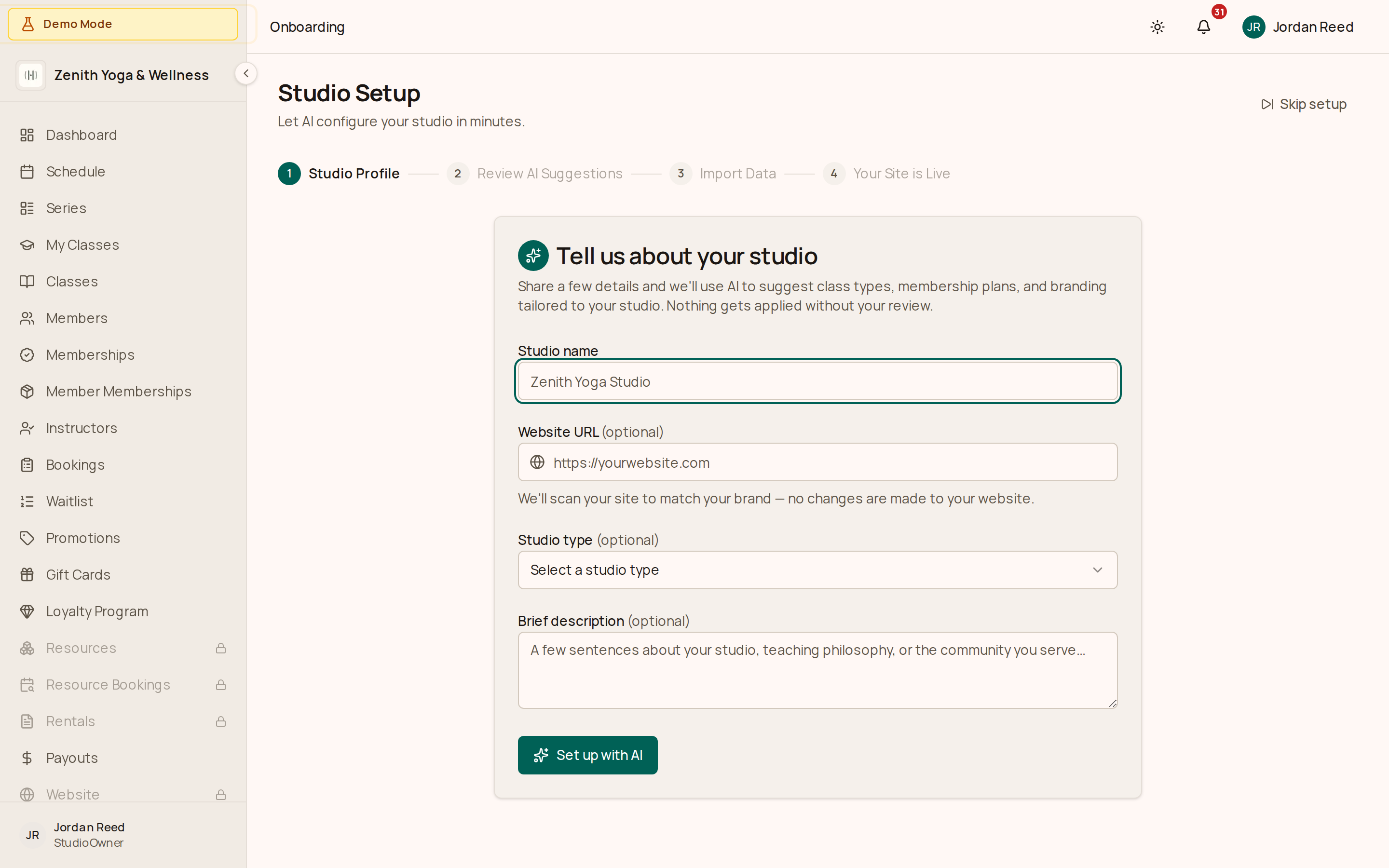 Drop in your website URL and our AI scrapes your branding, class types, and studio info automatically. No forms to fill, no data entry.